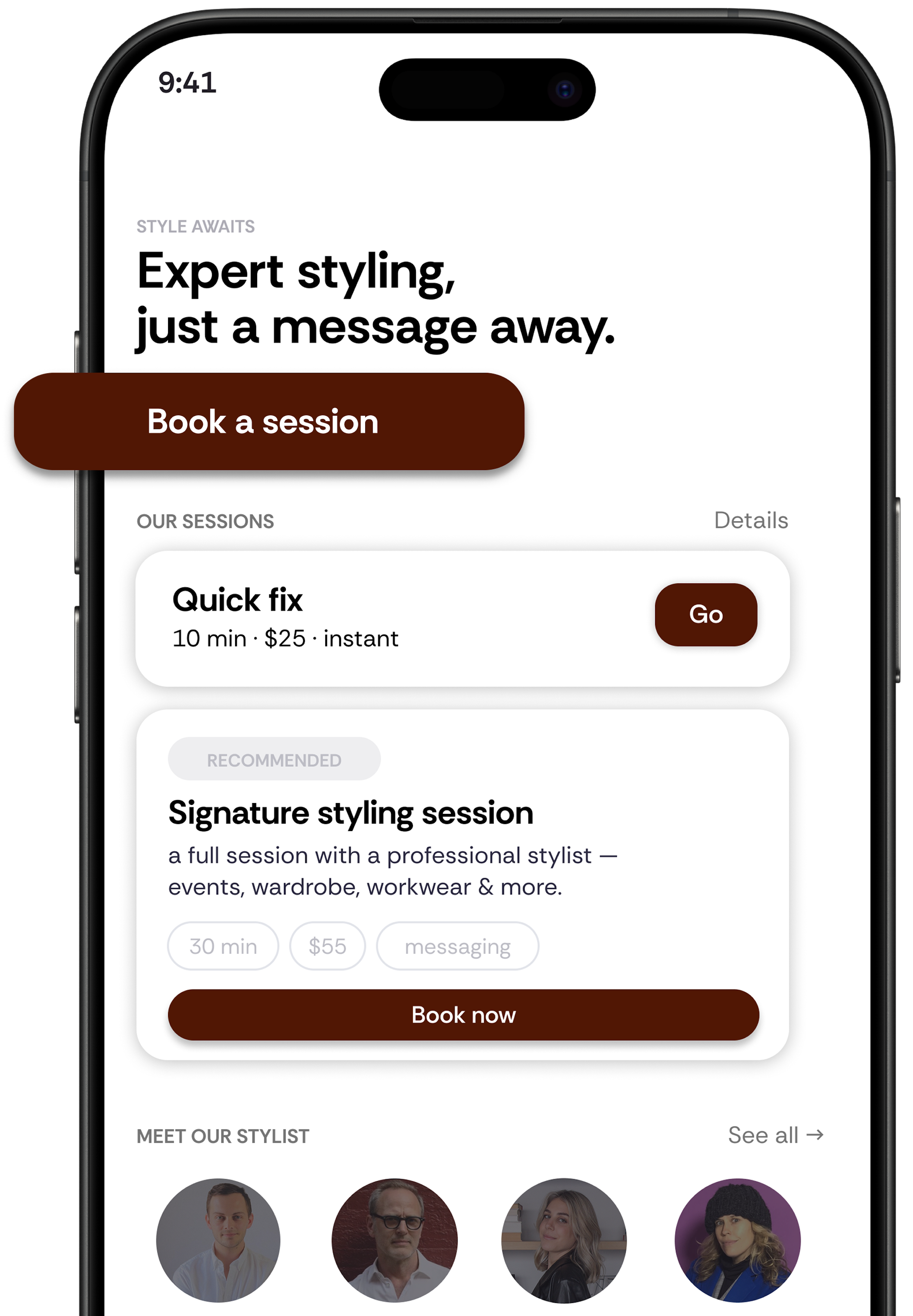 The quick fix is a 10-minute session, perfect for when you need a second opinion or a quick recommendation. The signature style session is a 30-minute deep-dive with a professional stylist tailored to your specific needs. Both sessions are conducted entirely through messaging, so you can connect with your stylist from anywhere.